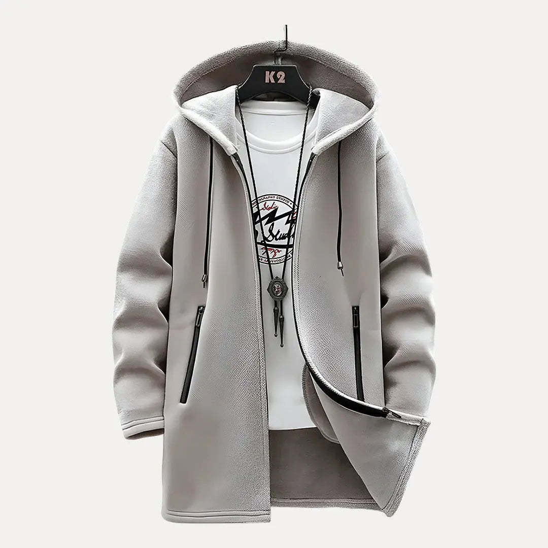 Eine praktische Herrenwinterjacke mit verlängerter Passform und schützender Kapuze, die angenehmen Tragekomfort bietet und sich ideal für vielseitige Alltagslooks eignet.